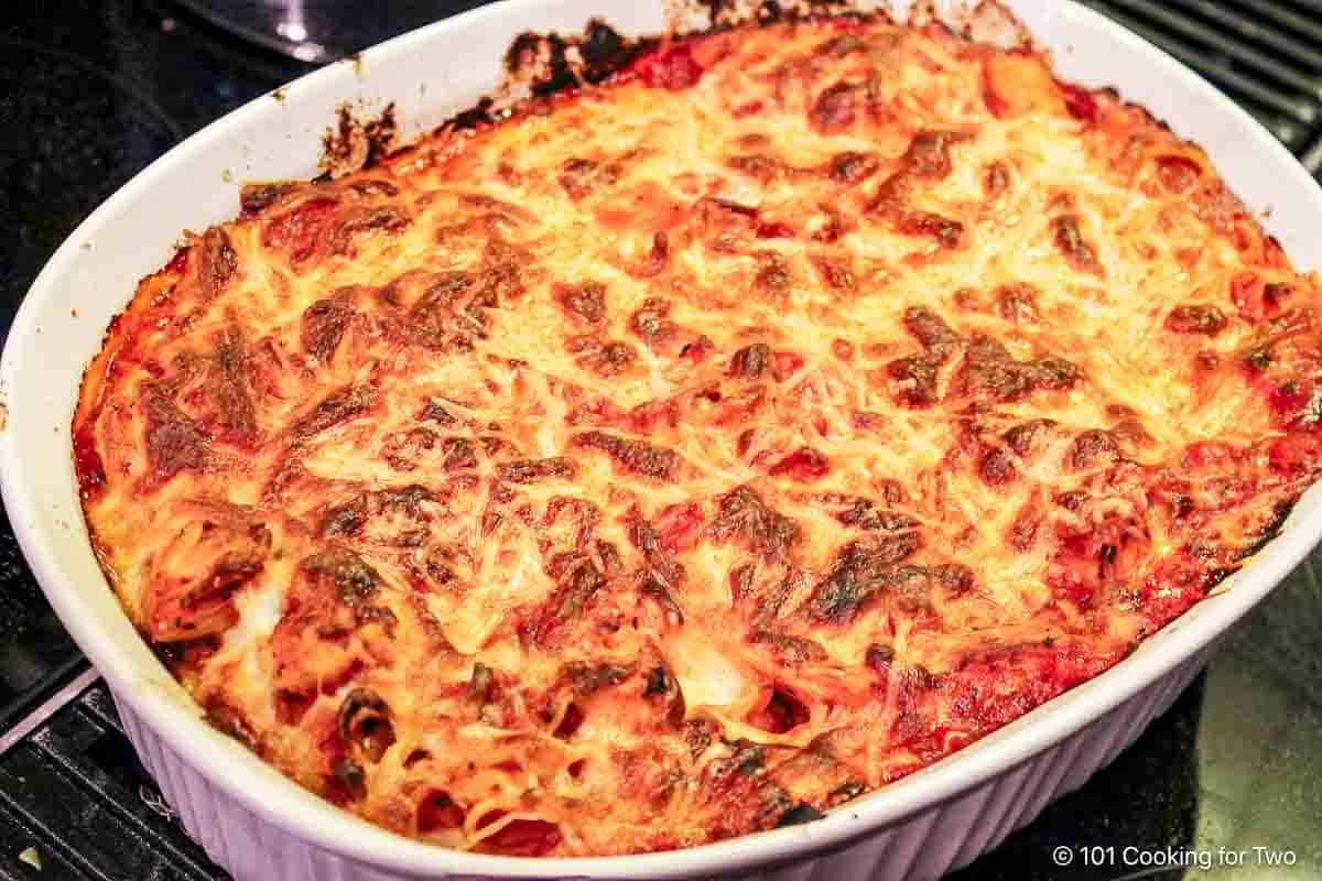 - Bake until sauce is bubbling and top brownโabout 25 minutesโlonger if you have refrigerated the dish.