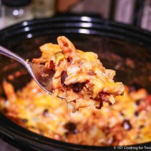 This easy Crock Pot Mexican Casserole is packed with tender pasta, chicken, black beans, and a spicy Southwest sauce loaded with cheese. Easy to make in almost any size crock pot with raw chicken, dry pasta, and pantry ingredients.