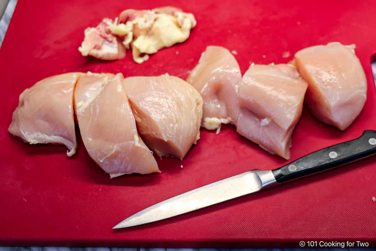 - Pat dry two skinless boneless chicken breasts. Trim and cut in half if average size or thirds if large.