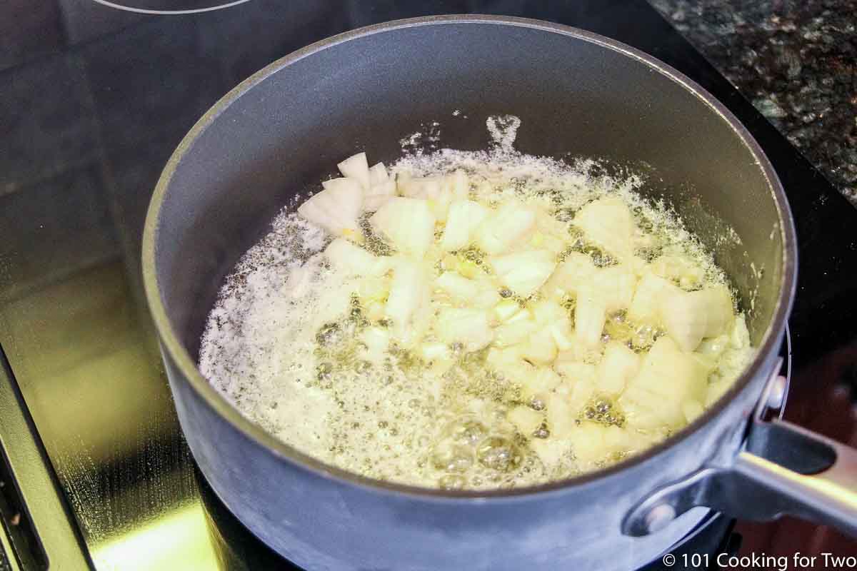 - Over medium-high heat, in a medium saucepan, melt 4 tablespoons of butter and add the onion. Cook until clearingโabout 3โ4 minutes.
