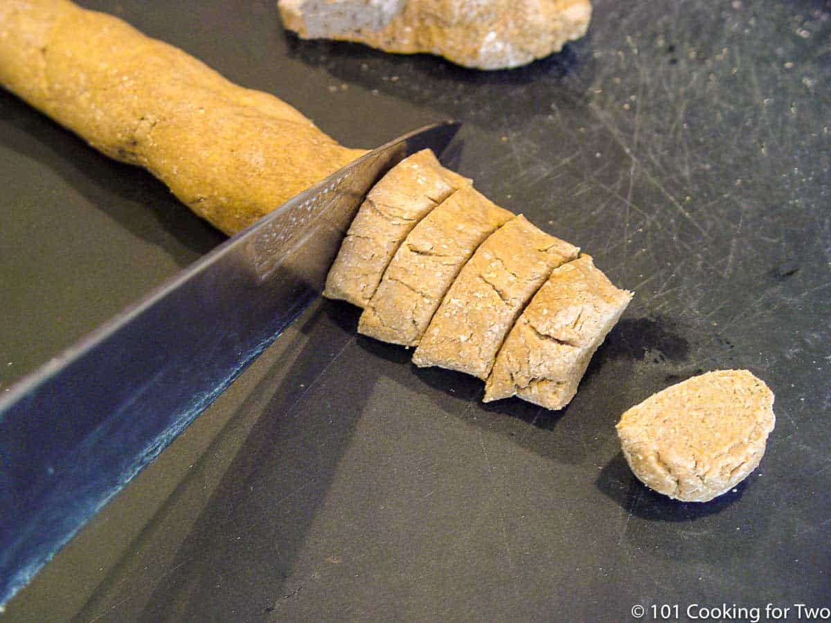 Roll out the dough to ¼ inch thick and use bone-shaped or other cookie cutters. Or roll into logs of 1-inch diameter. Cut into ¼ to ½ inch pieces.