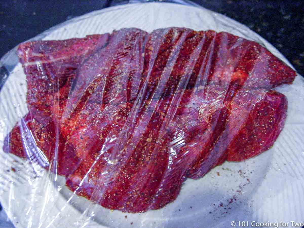 - Coat ribs generously on all sides with dry rub.For oven cooking, apply a light coat of liquid smoke before the rub (optional).